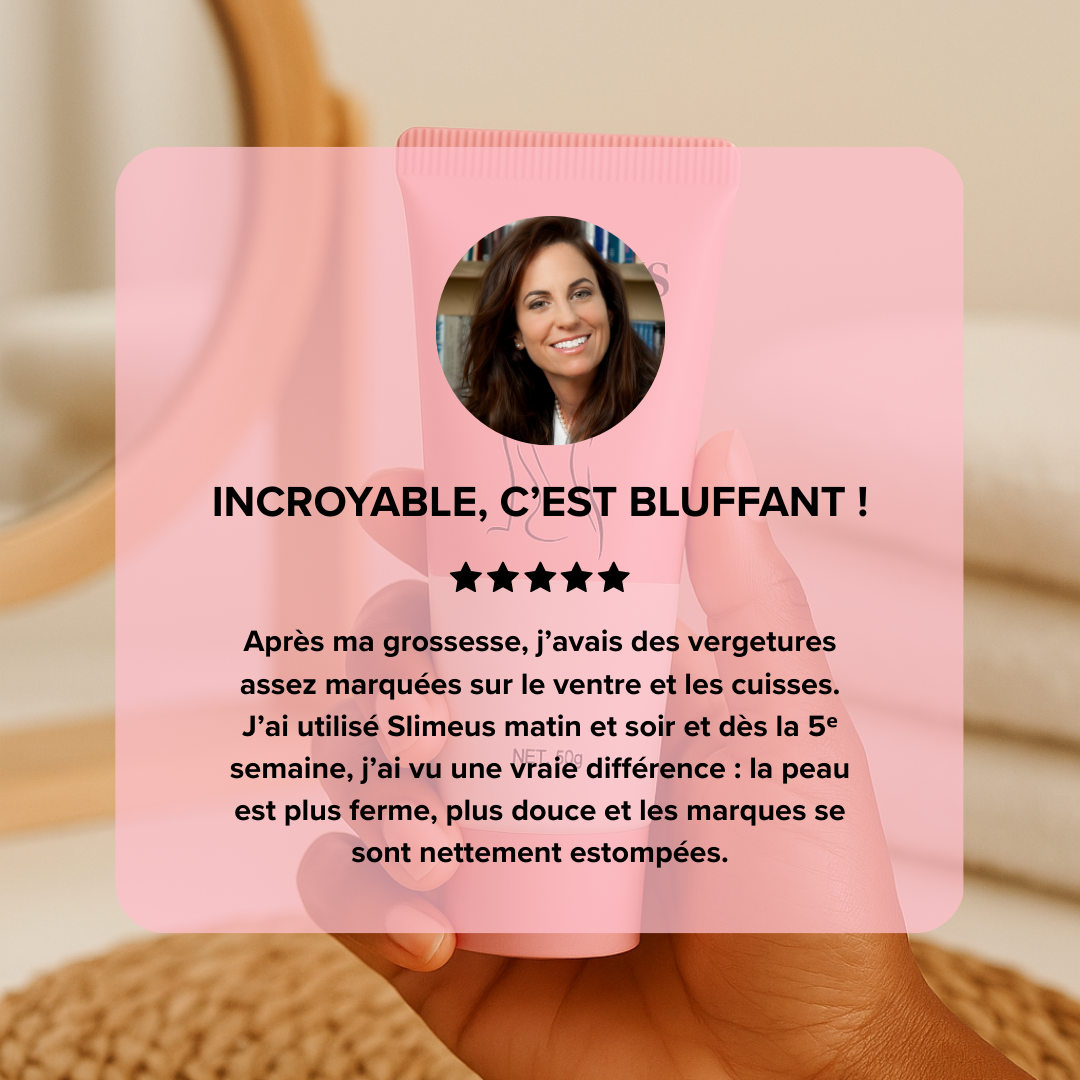 Après ma grossesse, j’avais beaucoup de vergetures sur le ventre et les cuisses. J’ai commencé à utiliser la crème Slimeus matin et soir et en quelques semaines, j’ai vu une vraie différence : ma peau est plus ferme et les marques se sont vraiment estompées. Texture agréable et qui pénètre vite, je recommande !